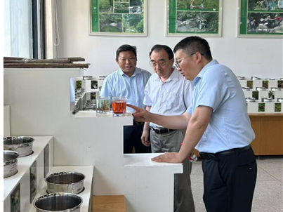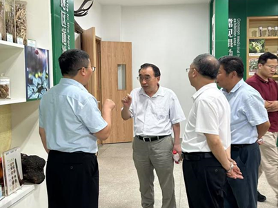 随后,吴付来教授来到安徽道地药材研展室。杨青山主任结合安徽省地形地貌模型,详细介绍了不同地理气候条件对道地药材生长的影响,并重点展示了石斛、灵芝等具有代表性的皖产药材,突显安徽中医药资源的独特优势。