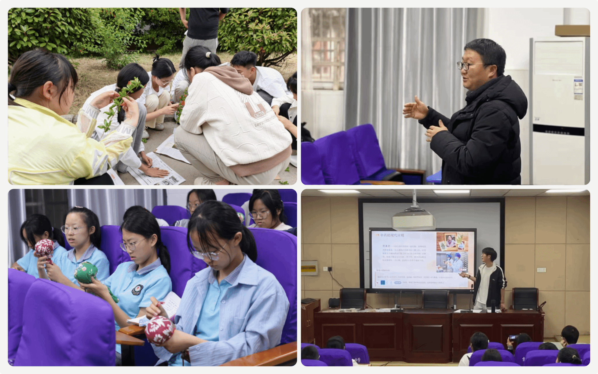 药学院精心组建了一支富有热情与专业素养的师生团队,将大学课堂的精髓浓缩,为四十中的学子们精心设计了一系列理论与实践相结合的课程。《走进中药世界——中药辨识六法》让学生们学会通过眼看、手摸、鼻闻、口尝等多种方法辨别中药材;《神奇的皖药王国,探索安徽道地药材》带领大家领略了安徽丰富的道地药材资源,了解了诸如亳白芍、霍山石斛等皖药的独特价值;“原来《诗经》里‘采采芣苢’的芣苢就是车前草!”“妈妈煮的绿豆汤竟暗合‘清热解毒’的药理!”《药食同源》则以“厨房里的中药房”为主题,用银耳莲子羹讲解滋阴润肺之道,借山楂陈皮茶阐释消食化积之理,让千年智慧跃然于舌尖。